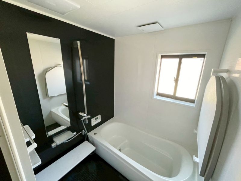 白を基調に、床と壁の一面に黒をあしらったスタイリッシュなデザイン。清潔感と高級感を兼ね備えた空間で、毎日のバスタイムが特別なひとときに。機能的かつお手入れもしやすい、快適な浴室です。