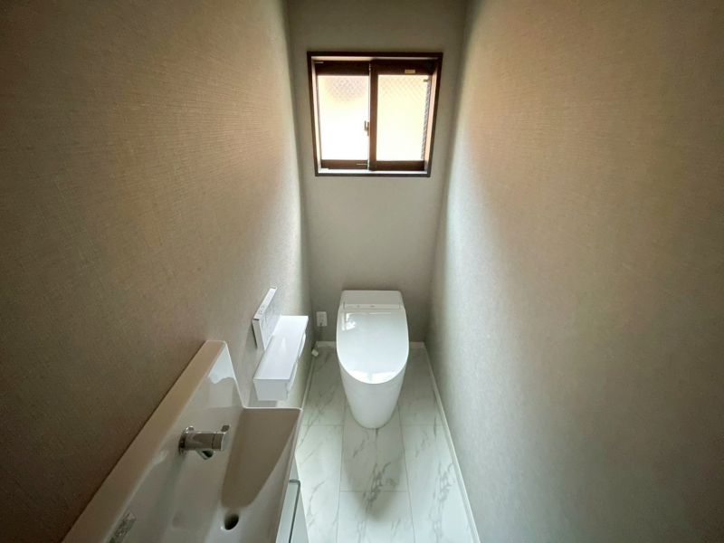 白を基調とした明るく清潔なトイレ。独立した手洗いカウンター付きで、衛生面にも配慮されています。