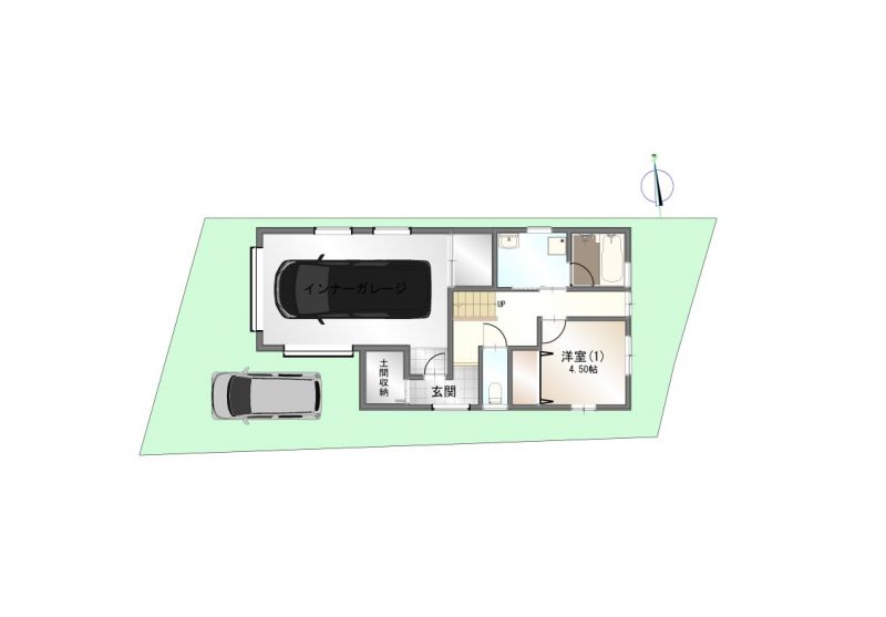 限られた敷地を最大限に活かしたインナーガレージ付き中古住宅!1階部分を有効活用し、2台分の駐車スペースを確保。雨の日のお出かけや荷物の出し入れもラクラクです。さらに、小学校まで徒歩圏内の好立地!子育て世代にも嬉しい、安心・便利な住環境が整っています。